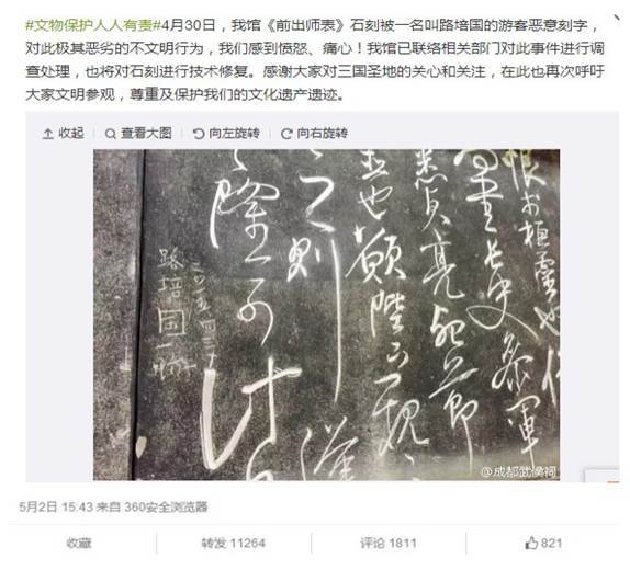 五一黄金周期间,成都武侯祠博物馆工作人员在巡查时发现,馆内重要文物《前出师表》石刻碑文被人在空白处刻上“路培国一游 二0一五四三十”等字眼。馆内的石狮、杨升庵的《临江仙》上也被刻上了“路培国一游”。
