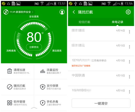 不仅如此,360安全中心通过云计算,保持动态更新骚扰电话号码数据库,实现自动高效拦截。手机用户可通过360手机卫士快速识别骚扰来电,并通过其云标记功能对各类骚扰、诈骗来电及时标记,防止其他手机用户上当。