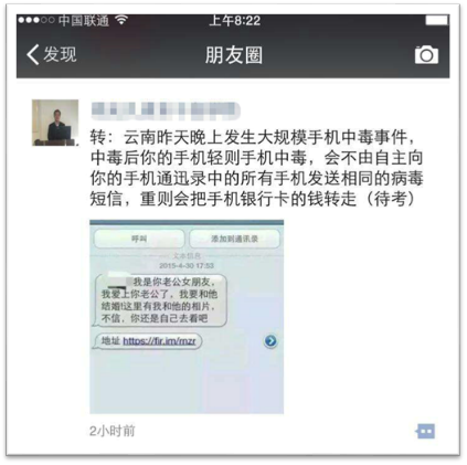 近日,微信朋友圈疯传一条安全预警,称云南昨晚发生大规模手机中毒事件,中毒后手机轻则会不由自主地向手机通讯录中所有手机发送相同的病毒短信,重则会把手机银行卡的钱转走,并附上了诈骗短信的截图。