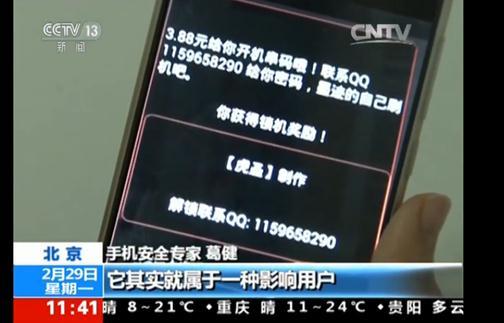 过年期间,市民张小姐下载了一款自动抢红包软件,没想到还未使用软件进行抢红包,手机屏幕就被锁死了,完全无法使用。并且锁死的手机屏幕上显示“3.88元给你开机串码哦!联系QQ1159658290给你密码”,由于处于过年期间不方便刷机,木马索要金额也并不多,急于为手机解锁的张小姐便通过QQ联系,支付了3.88元。