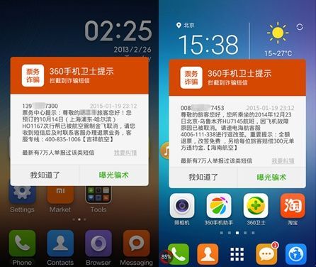 防骗提醒:360手机卫士安全专家提醒广大旅客,如果收到航班取消或改签等短信千万不要轻信,建议拨打航空公司统一客服或登录官网进行核实;其次,退票或改签都不需到ATM机操作,要求到ATM机上操作的都是骗局。专家指出,可在手机中安装类似360手机卫士等安全软件,帮助鉴别和拦截诈骗短信和电话。
