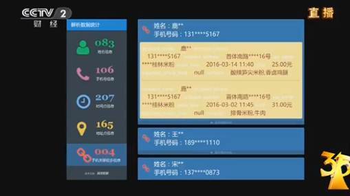 3.15晚会现场,主持人为观众演示了惊悚一幕。现场观众在连接了晚会现场的安全WiFi后,主持人邀请大家打开自己的购物、打车、外卖等软件,不过数秒,大屏幕上则显示出了参与活动观众的具体信息。屏幕显示,已获取83位观众的姓名信息、获取手机号码106条、时间信息207条、地点信息165条。晚会大屏幕甚至还显示出各位参与活动观众购物订单、外卖订单、购买电影票等详细信息。